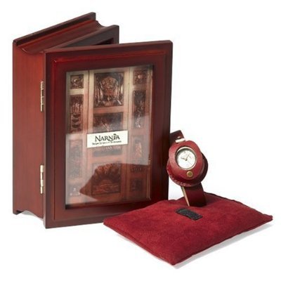 Celebrate the magic of the classic story of Narnia with this Amazon.com Exclusive limited edition collectible timepiece. This unique watch is designed to represent the special vial containing magical healing properties that was given to Lucy by Father Christmas. The watch has an antiqued goldtone finish and comes tucked inside a red leather pouch that loops over a matching strap with a buckle closure. Unsnap the pouch, and you can actually pull the watch out. It's small, measuring about an inch in wide, and unusually thick, with a substantial feel. The crown, placed at the top center as on a pocket watch, resembles the lid of the vial, and small "bubbles" between the watch crystal and the recessed dial create the illusion of liquid inside. The textured silvery-white dial features elegant goldtone breguet hands, a seconds hand, and Roman numerals at the quarter hours. This watch comes packaged in a beautiful wood veneer box with a velvety red interior and a glass lid. It is one of a limited edition of 1000 available exclusively through Amazon.com. Also included is a certificate of authenticity that tells the story of Lucy's bravery and heroism.