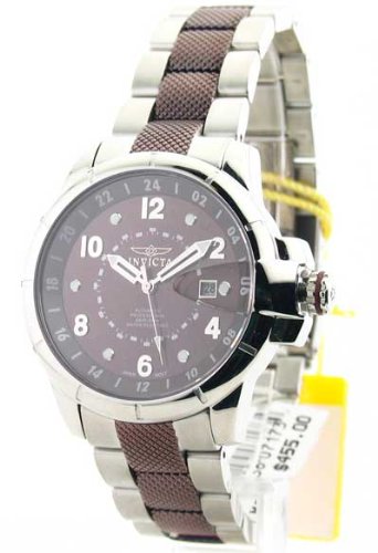 The Invicta Men's Signature Collection Prowler Automatic Watch features dual 12-hour and 24-hour timekeeping functions, as well as a brown ion-plated bracelet for a stylish, versatile appearance. Constructed with a stainless steel case, the watch includes a stationary stainless steel bezel with grooved hour markers, and a textured, blue ion-plated stainless steel link bracelet that's secured with a fold-over safety clasp. A strong mineral window shields the rich brown dial, which features silver-tone Arabic numerals displaying both the 12- and 24-hour clock cycles. The dial also includes a date calendar at three o'clock and an inner ring of silver minute indexes. Featuring Japanese-automatic movement, this timepiece is water resistant to 660 feet (200 m).