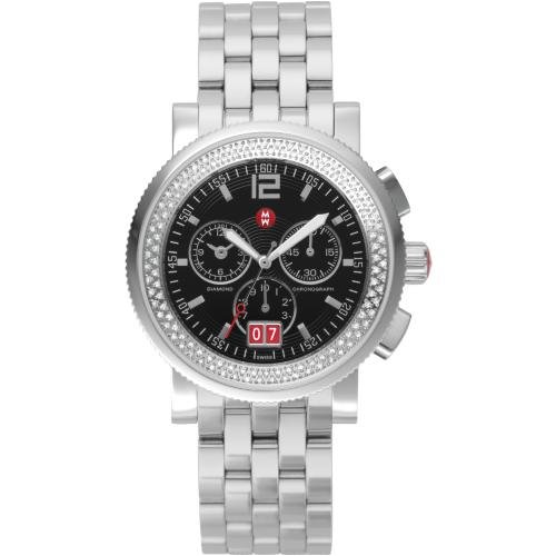 One hundred and eighteen sparkling diamonds surround the black enamel dial of our Sport Sail Large timepiece. A three-eye chronograph and contrasting red date window make this timepiece a sporty addition to any wardrobe. The stainless steel bracelet is interchangeable with any 20mm Michele strap. null Read more...