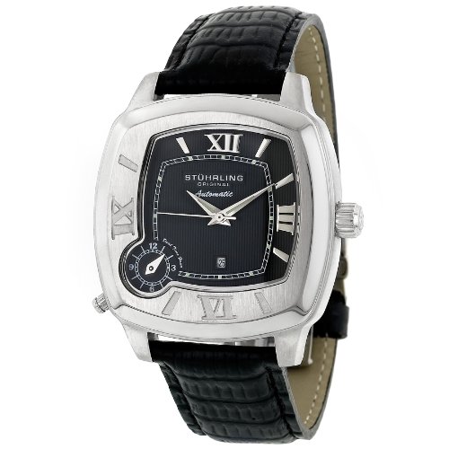 Boasting a sophisticated blend of classic and contemporary design, the Stuhrling Original Men's Lifestyle 'Piattino Di Volo' Dual Time Zone Watch features a sleek stainless steel bezel and corresponding, square case with handsome outward contours. The bold, black dial is protected by a synthetic sapphire crystal and offset by luminescent markers and hourly Roman indexes appearing at the three and 12 o'clock that continue on the outer bezel with etched, silver-tone markers and Roman numerals at the six and nine o'clock positions. A small calendar date window sits above the six o'clock adjacent to a handsome sub-dial contouring into the case in place of the seven o'clock that gives this watch its convenient dual time zone feature. The sub-dial is distinguished with luminescent hands, Arabic hourly indexes, and stick markers. A textured black band made of genuine French leather and fastened with a push-button clasp gives the Piattino Di Volo an added boost of style. This watch also features water resistance to 165 feet, reliable Swiss-quartz movement, and a distinctive Stuhrling gift box for an elegant presentation. Read more...
