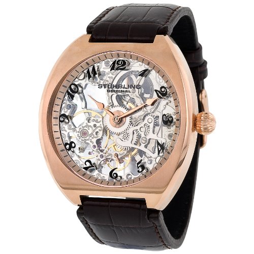 The first pure mechanical watch in Stuhrling Original's history, the Men's Special Reserve Chernabog Skeleton Automatic Watch is an ideal choice for collectors and those with discerning tastes. This stunning timepiece does not have a rotor attached to the movement, so you must manually window the crown to keep it running, a design that puts you in touch with the artistry and precision of automatic movement. Its remarkable 17-jewel mechanical engine can hold 40 hours of power reserve on its ample mainspring, while a rose gold-tone tonneau-case with exhibition back lends durability. Black Arabic numerals on a skeletonized dial combine with a genuine leather strap for a sleek, yet laidback look, and a Krysterna crystal guards against wear and tear. Water resistant to 165 feet, the Chernabog arrives in a distinctive Stuhrling presentation box with instruction manual, and cleaning cloth. Read more...