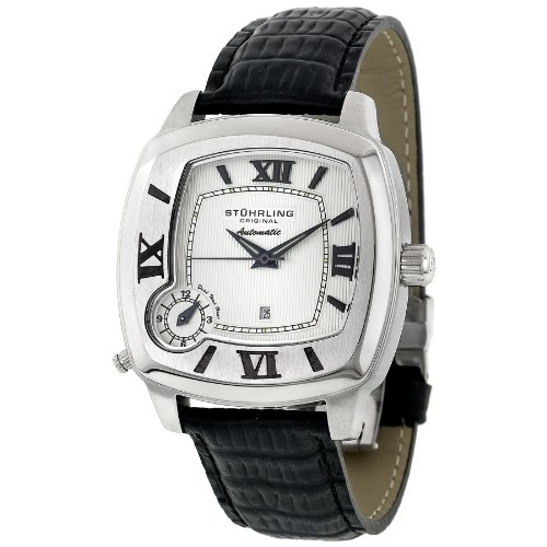 Crisp and sophisticated, the Stuhrling men's Piattino Di Volo Dual Movement watch is the perfect accessory to keep track of both business meetings and lingering afternoons on the golf course. Constructed with a 46-millimeter stainless steel bezel, this handsome timepiece also includes a square stainless steel bezel with a subtle art deco design, and a black textured leather band with simple deployment buckle. A tough synthetic sapphire window protects the silver-tone dial face, which features black Roman numerals at three and 12 o'clock, sleekly complementing the Roman numerals inscribed on the silver-tone bezel at six and nine o'clock, along with black hour indexes. A date calendar rests above six o'clock, and a sub-dial at eight o'clock depicts a more traditional watch face, with Arabic numerals at three, six, nine, and 12 o'clock. In addition, this automatic-self-wind-movement watch is water resistant to 165 feet.