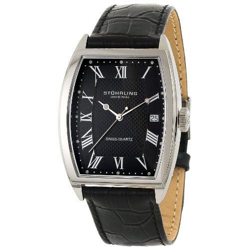 Treat yourself to a look of Manhattan sophistication with the Stuhrling Original Men's Classic 'Park Avenue' Swiss Quartz Watch. Standing out with its silver and black design, this timepiece is crafted from surgical-grade stainless steel with a black alligator-embossed genuine French leather strap. Framed in a classic Tonneau-shaped case, the black dial is hydraulically pressed with a pyramid pattern in the center. It features silver-tone accents, including Roman numeral hour markers and hands, as well as a date display at the three o'clock position. Featuring precise Swiss quartz movement, this Stuhrling watch is water resistant to 165 feet (50 M). Read more...