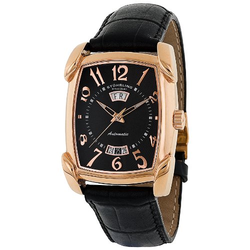 A striking rose-gold and black palette gives the Men's Boardroom "Madison Avenue" Automatic Watch from Stuhrling Original a sleek, urbane look that's tempered by the casual feel of an embossed leather strap. This understated, masculine timepiece boasts a quality 22-jewel automatic self-wind movement and battery-free operation--simply move your arms to power the watch. It also features a rectangular, rose gold-tone stainless steel case and bezel and a dramatic black dial complete with day and date complications at 12 and six o'clock, luminous-tipped hands, and gold-tone Arabic numeral markers. Water resistant to 165 feet (50 M), the Madison Avenue has a scratch-resistant Krysterna crystal for long-term protection against wear and tear. The watch arrives in a Stuhrling Original black and orange gift box along with a cleaning cloth. Read more...
