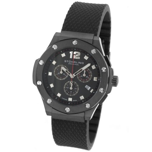 This Stuhrling Apocalypse men's watch is a stylish chronographic watch to end all watches. The large 47-millimeter, surgical-grade stainless-steel, round black case sports a hydraulic pressed black dial with a diamond-net ray pattern, and Luminova-tipped, skeletonized silver hands. Protected by a Krysterna crystal, the face boasts individually applied, square silver hour markers and the Arabic numeral 12, and an add and split function chronograph with seconds, minutes, and 12-hour counter, charcoal-ringed subdials. Constructed of stainless-steel, the black PVD-coated decagonal bezel ring with applied silver screws, and matching knurled-edge crown with 12 teeth finish off the remarkable centerpiece. This unrivaled chronometer is showcased on a black 22-millimeter, tapered silicon-rubber strap that features a diamond-net pattern, and a stainless-steel push-button deployment clasp with safety lock. As durable as it is delightful, this analog watch runs on a six-jewel, Swiss quartz movement with quick-set date complication and is water resistant to a depth of 330 feet. Read more...
