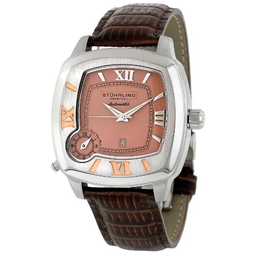 Boasting a sophisticated blend of classic and contemporary design, the Stuhrling Original Men's Lifestyle 'Piattino Di Volo' Dual Time Zone Watch features a sleek stainless steel bezel and corresponding, square case with handsome outward contours. The eye-catching salmon-tone dial is protected by a synthetic sapphire crystal and offset by luminescent markers and hourly Roman indexes appearing at the three and 12 o'clock that continue on the outer bezel with etched, copper-tone markers and Roman numerals at the six and nine o'clock positions. A small calendar date window sits above the six o'clock adjacent to a handsome sub-dial contouring into the case in place of the seven o'clock that gives this watch its convenient dual time zone feature. The sub-dial is distinguished with luminescent hands and black Arabic hourly indexes and stick markers. A textured brown band made of genuine French leather and fastened with a buckle clasp gives the Piattino Di Volo an added boost of style. This watch also features water resistance to 165 feet, reliable Swiss-quartz movement, and a distinctive Stuhrling gift box for an elegant presentation. Read more...
