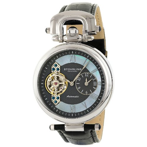 A fresh and daring take on a classic style, the Men's Boardroom "Emperor" Dual Time Zone Watch from Stuhrling Original combines a regal design with innovative touches for a one-of-a-kind look. This striking timepiece boasts a quality 20-jewel automatic movement and battery-free operation--simply move your arms to power the watch. A charcoal-colored, hydraulically stamped open heart Argentè Guillochè dial features a mother-of-pearl inlay and dual time display. A silver-tone stainless steel case and bezel add a sleek touch, and a genuine leather strap closes with a deployment clasp with buckle for a secure, comfortable fit. Water resistant to 330 feet (100 M), the Emperor includes a scratch-resistant Krysterna crystal to protect against wear and tear. The watch arrives in a Stuhrling Original black and orange gift box. Read more...