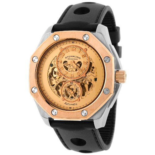 Simply stunning, with an ultra-contemporary design and rose gold-tone case, the Men's Lifestyle "Nemo" Skeleton Automatic Watch from Stuhrling Original combines a real "wow" factor with impeccable Swiss craftsmanship. A compelling conversation piece, this versatile timepiece boasts a reliable 22-jewel self-wind automatic movement and battery-free operation--simply move your arms to power the watch. It also sports an eye-catching skeleton dial that is complete with two subdials, silver-tone screw-like hour markers on the outer rim, and a durable black rubber strap. Water resistant to 165 feet (50 M), the Nemo has a scratch-resistant Krysterna crystal for long-term protection against wear and tear. The watch arrives in a Stuhrling Original black and orange gift box along with a cleaning cloth.