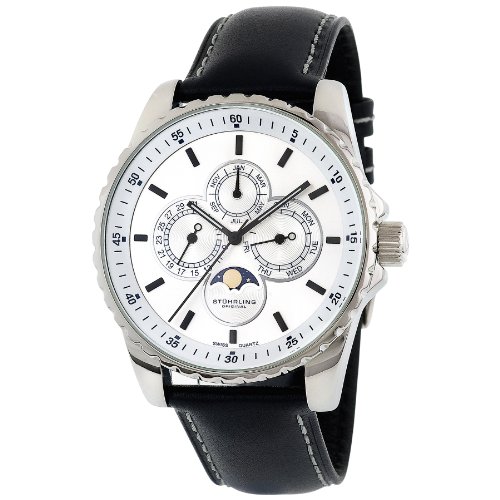 Offering a generously sized, bright white dial and genuine moon phase subdials with day, date, and month complications ,the Men's Classic "Artemis" Moon Phase Swiss-Quartz Watch from Stuhrling Original impresses with its clean-cut, masculine look. Boasting the reliability and precision of Swiss-quartz movement, this striking timepiece features a hydraulic Guillochè concentric circle design on its main dial and flocked-finish subdials. Black hands and hour numbers make it easy to read the time at a glance, and a comfortable leather strap has contrast stitching for a cool, modern look. A scratch-resistant Krysterna crystal combines with water resistance to 165 feet (50 M) to protect against wear and tear, while an adjustable buckle closure ensures a secure, custom fit. The Artemis arrives in a Stuhrling Original black and orange gift box along with a cleaning cloth.