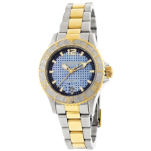 With its hydraulically embossed dimpled blue mother-of-pearl dial, the Ladies Lifestyle 'Regatta' Automatic Divers Watch from Stuhrling Original is a striking, durable timepiece with contemporary flair. Made from antimagnetic 316L surgical grade stainless steel for exceptional durability, a circular case, wave-patterned bezel, and two-tone bracelet band offer striking style and a warm, sophisticated look. Luminous hands, hour markers, and Arabic numeral at the 12 o'clock position are clear and easy to read, while water resistance to 330 feet guards against wear and tear. The traditional appeal of automatic self-wind movement also makes the Regatta a truly special timepiece that adds an elegant, sporty touch to your ensembles. It arrives in a presentation box with instruction manual, and cleaning cloth.