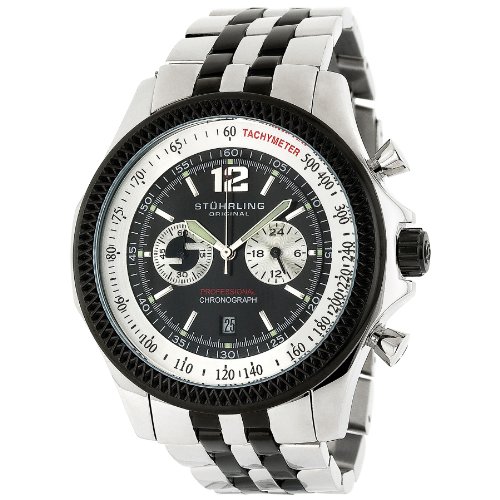 Keep on target with the Stuhrling Original Men's Sportsman 'Targa Elite' Chronograph Watch. Built strong and sturdy with a stainless-steel Tonneau-shaped case, black bezel, and five-link black-striped bracelet, this timepiece is perfect for keeping up with your active lifestyle. Framed by a white tachymeter scale, the hydraulic-pressed black dial features Roman numeral hour markers, luminous hands, a date display at the six o'clock position, and 60-minute and 24-hour chronograph subdials. Featuring quality Japanese quartz movement, this sporty Stuhrling watch is water resistant to 165 feet (50 M). Read more...