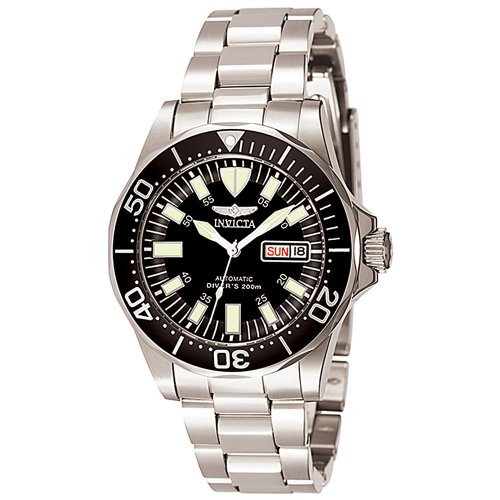 Designed for serious divers, the Invicta Men's Signature Collection Pro Diver Automatic Watch features luminous hour markers and a unidirectional bezel to help you keep track of your underwater explorations. Constructed with stainless steel case, the watch includes a link wristband that's secured with a fold-over safety clasp. A scratch-resistant sapphire window shields the black dial, which features bold, luminous hour markers, slim minute indexes, and Arabic numerals in five-minute increments. The dial also includes a day-and-date calendar at the three o'clock position. Featuring Japanese-automatic movement, this sporty timepiece is water resistant to 660 feet (200 m).