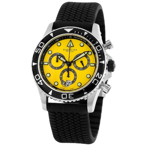 A bold, bright yellow dial combines with clean lines and a streamlined design in the Men's Atlantis Acropolis Swiss Chronograph Watch from Stuhrling Original. Stylish and sporty, from its polished stainless steel case to its black-tone unidirectional bezel, this handsome timepiece is up for anything. A date display peeks out above six o'clock, while a sturdy and comfortable rubber band ensures long term, comfortable wear. Water resistant to 330 feet, and boasting the precision of Swiss quartz movement, the Atlantis Acropolis arrives in a distinctive Stuhrling presentation box with instruction manual, and cleaning cloth. Read more...