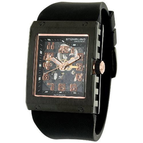 Exciting and bold, with a sleek, futuristic edge, the Men's Special Reserve "Centurion" Big Skeleton Automatic Watch from Stuhrling Original has an ultra-contemporary design that turns heads and inspires conversation. Carefully made with meticulous attention to detail, this stunner of a watch boasts a quality 20-jewel automatic movement and battery-free operation--simply move your arms to power it up! A square, black-tone stainless steel case surrounds a hand-engraved skeleton dial and rotor with blued steel screws. A black rubber strap offers a comfortable, secure fit. Water resistant to 165 feet (50 M) and complete with a scratch-resistant Krysterna crystal, the Centurion arrives in a Stuhrling Original black and orange gift box along with a cleaning cloth. Read more...